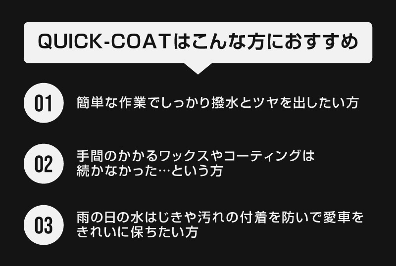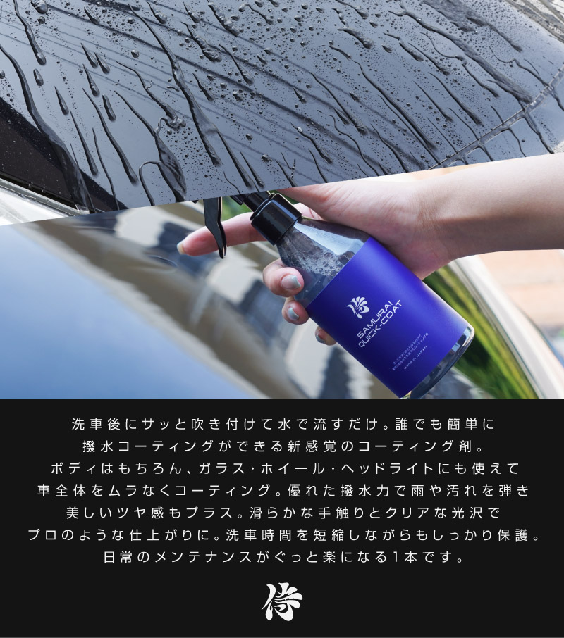 トップ > サプライ品 > 洗車・カーケア用品・カーメンテナンス > サムライプロデュースオリジナル > サムライクイックコート QUICK COAT 300ml 超撥水コーティングスプレー 濡れたままのボディに吹きかけるだけ 超時短の次世代コーティング 全車色対応 大容量 艶出し 光沢 洗車用品 メンテナンス用品 ウィンドウケア コーティング剤 カーウィンドウ用撥水剤 ケア用品