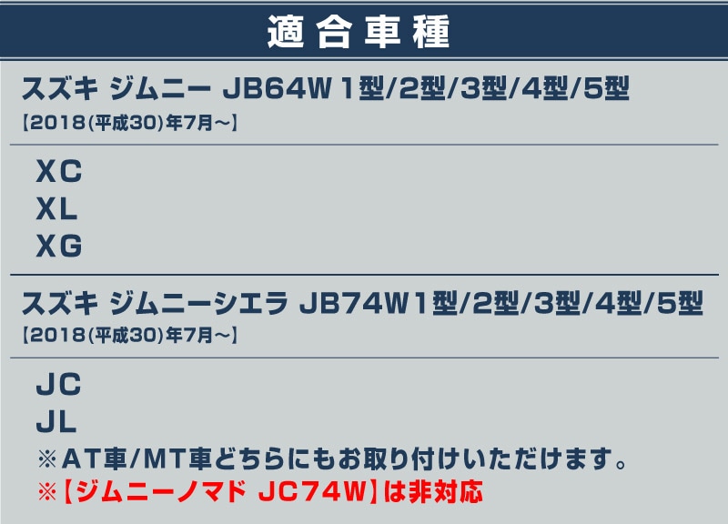 ※AT車/MT車どちらにもお取り付けいただけます。 ※【ジムニーノマド JC74W】は非対応 |