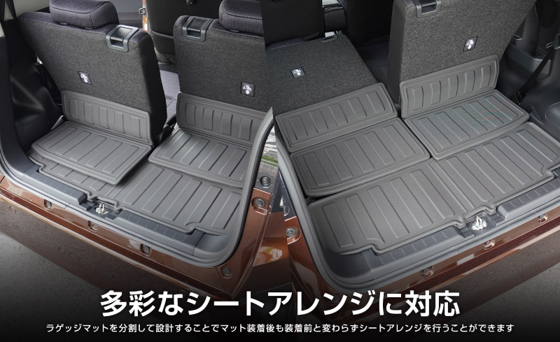 車種専用設計だからフィット感は抜群。シートやラゲッジの形状にぴったり沿い、機能性を損なうことなく広範囲をカバーします。