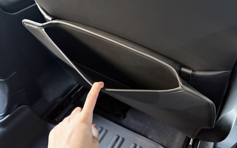 後部座席のお子様の足による汚れや傷からフロントシートをしっかり保護し、さらに収納ポケットを増設することで小物や必需品を整理整頓できます。