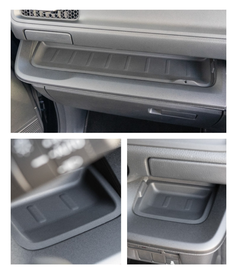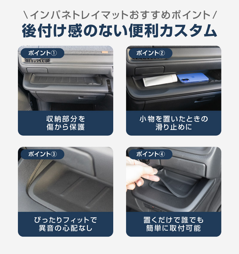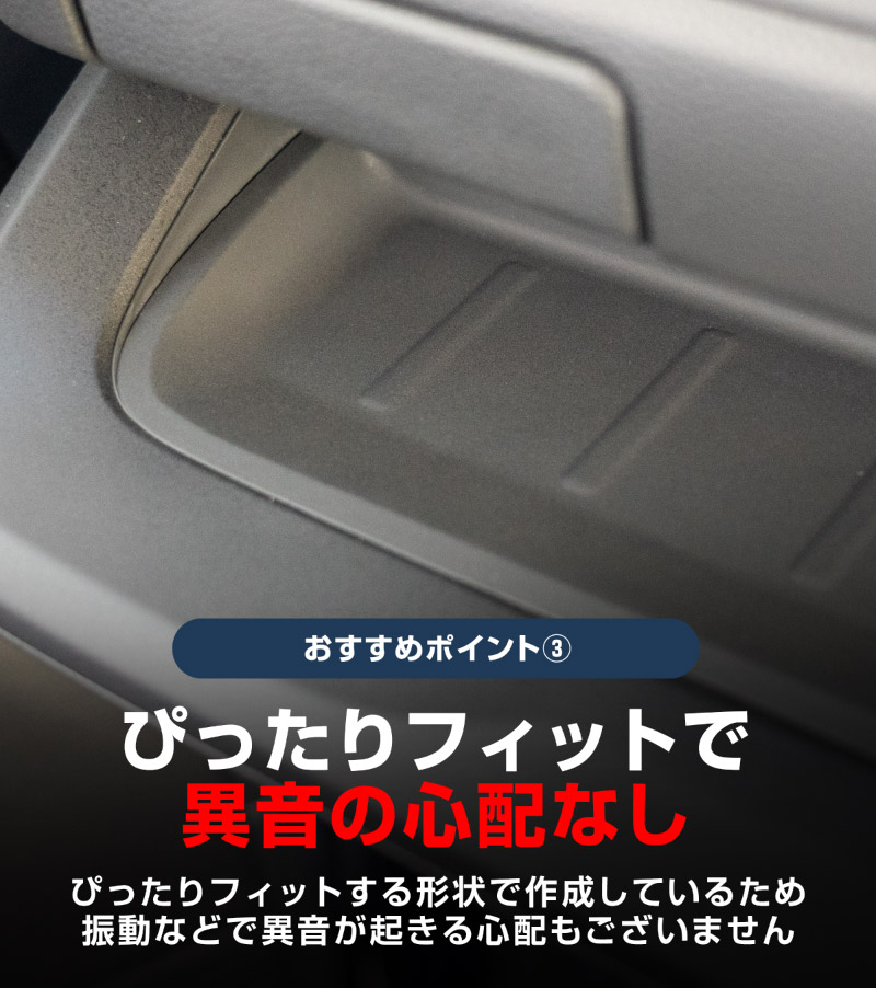 インテリアトレイ用マットは、運転席・助手席それぞれのトレイ形状に合わせた車種専用設計。はめ込むだけで簡単に取り付けでき、走行中のガタつき音や小物のズレ、キズを防止します。
