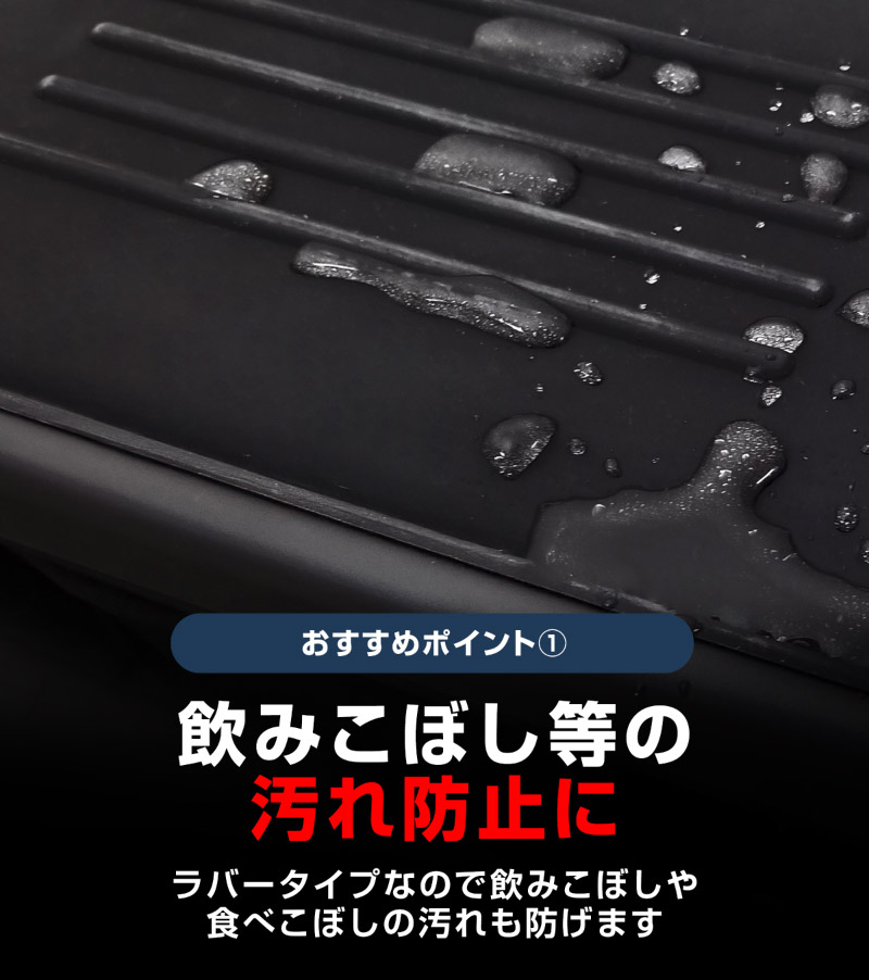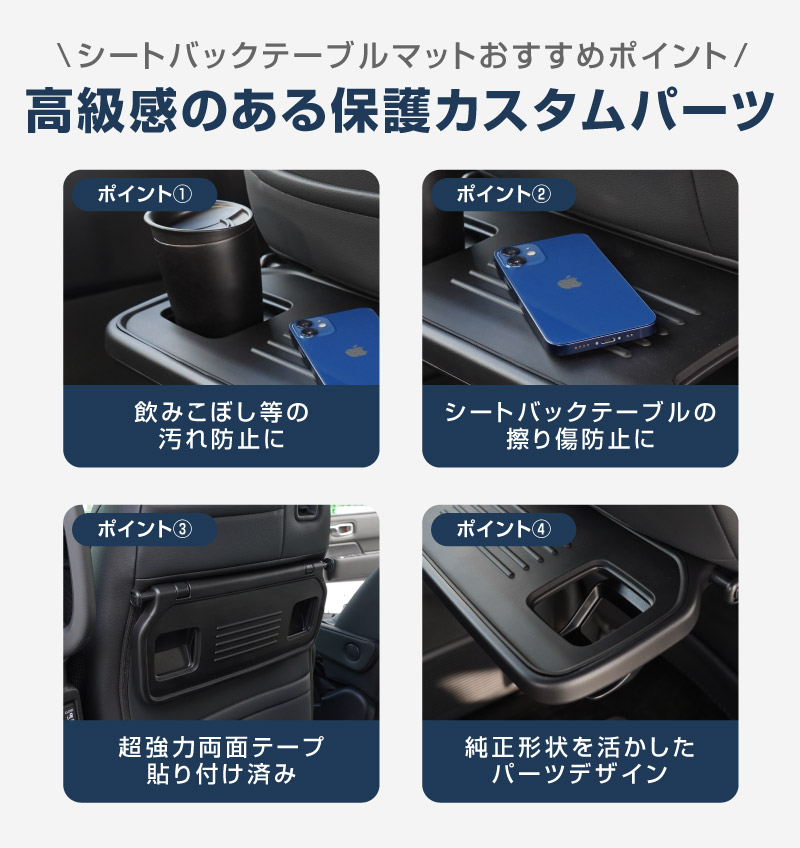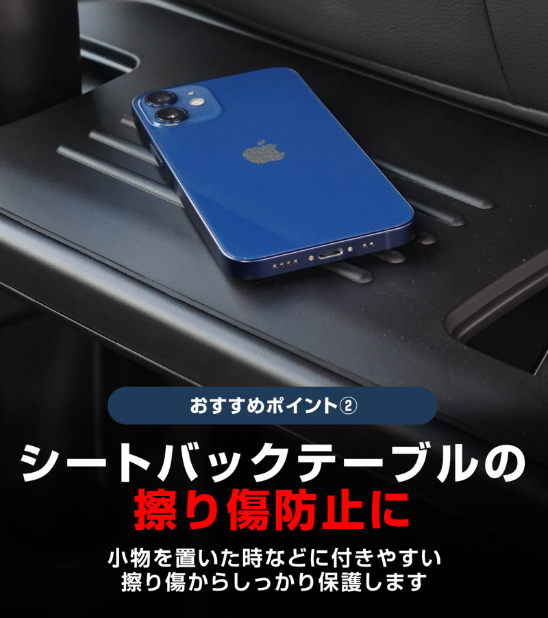バックテーブルマットは、コンビニフック付きバックテーブルに対応した専用設計。小物やスマートフォンの滑り止めとしてはもちろん、飲みこぼしなどの汚れ防止にも役立ちます。