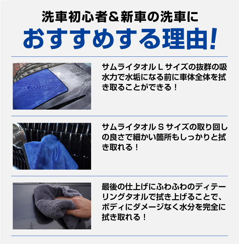 超吸水 サムライタオル Sサイズ 40cm×40cm & Mサイズ 45cm×75cm & ディテーリングタオル お得な3枚セット マイクロファイバータオル サムライプロデュースオリジナル 洗車タオル 超吸水 洗車 タオル