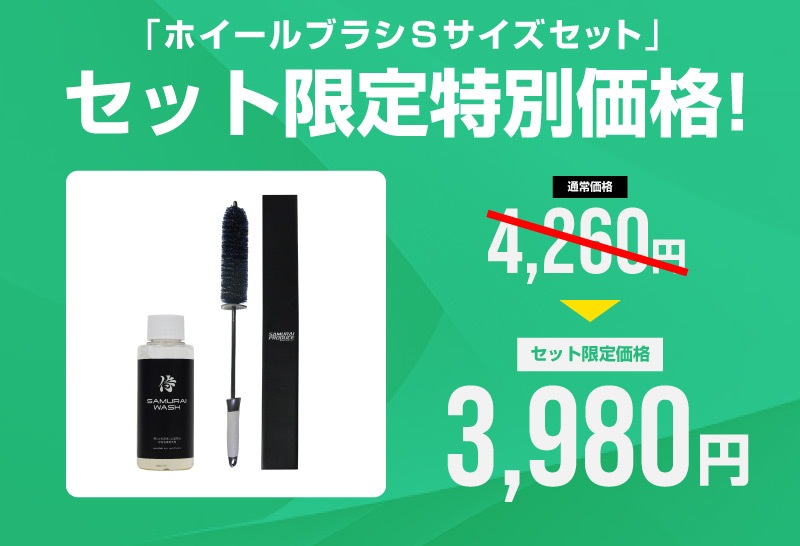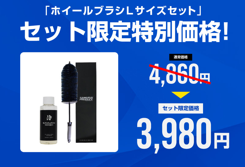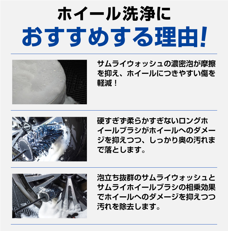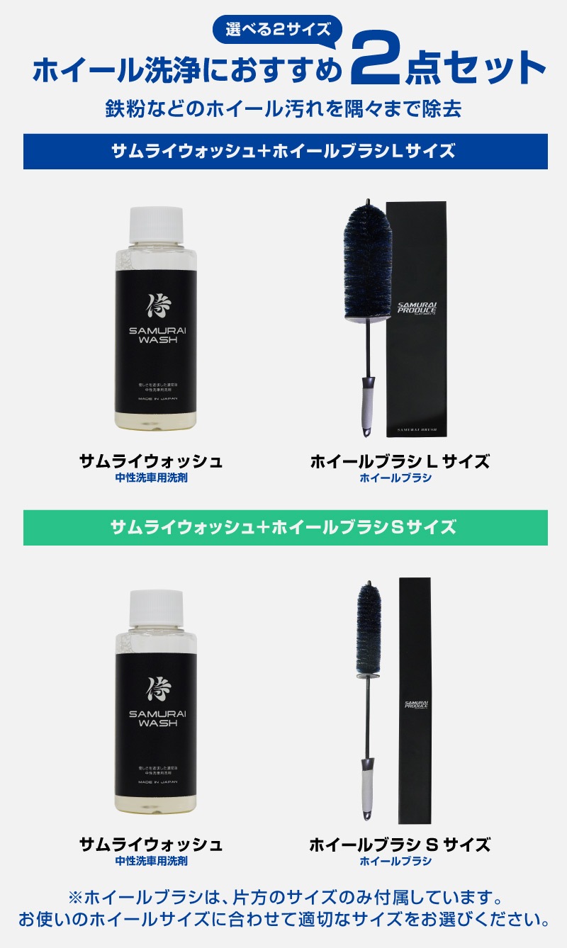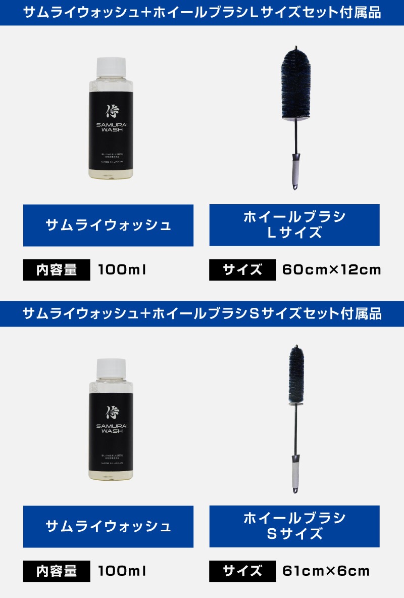トップ > サプライ品 > 洗車・カーケア用品・カーメンテナンス > サムライプロデュースオリジナル > 【2/23迄 10%off】【セット割】【サムライウォッシュホイールブラシセット】サムライウォッシュ 濃密泡カーシャンプー 100ml 希釈タイプ & サムライホイールブラシ 選べる2サイズ Sサイズ Lサイズ 全車色対応 コーティング車 OK ノーコンパウンド カーケア用品 メンテナンス